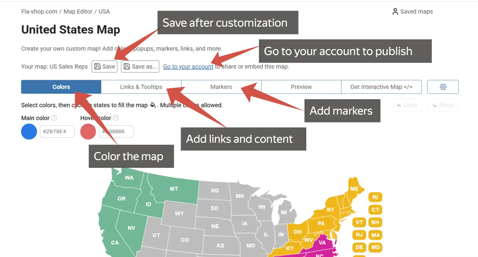 In this guide, we’ll use a US interactive map as the main example, but the same steps apply to our other maps (World map with clickable countries, UK, Germany, France, etc.)